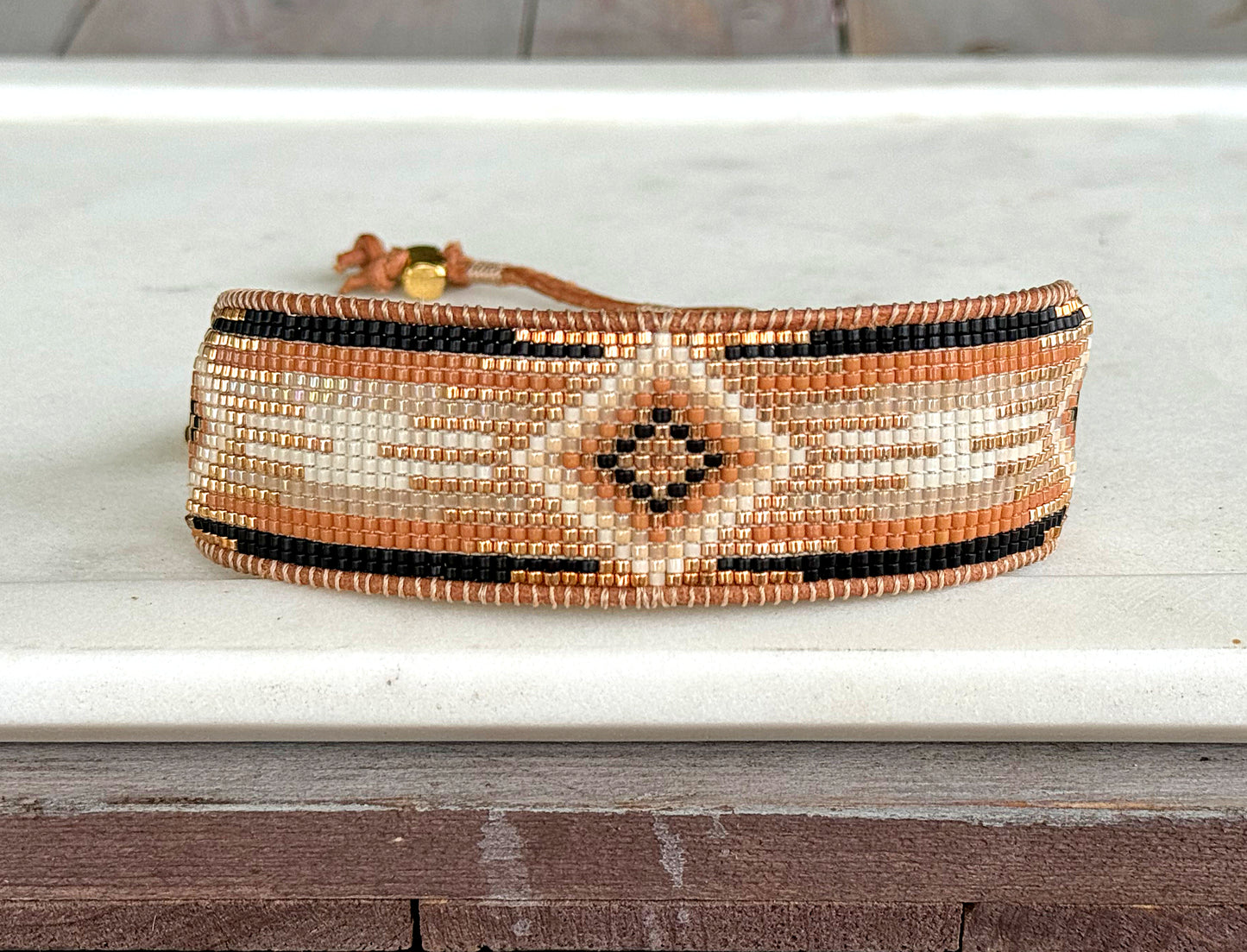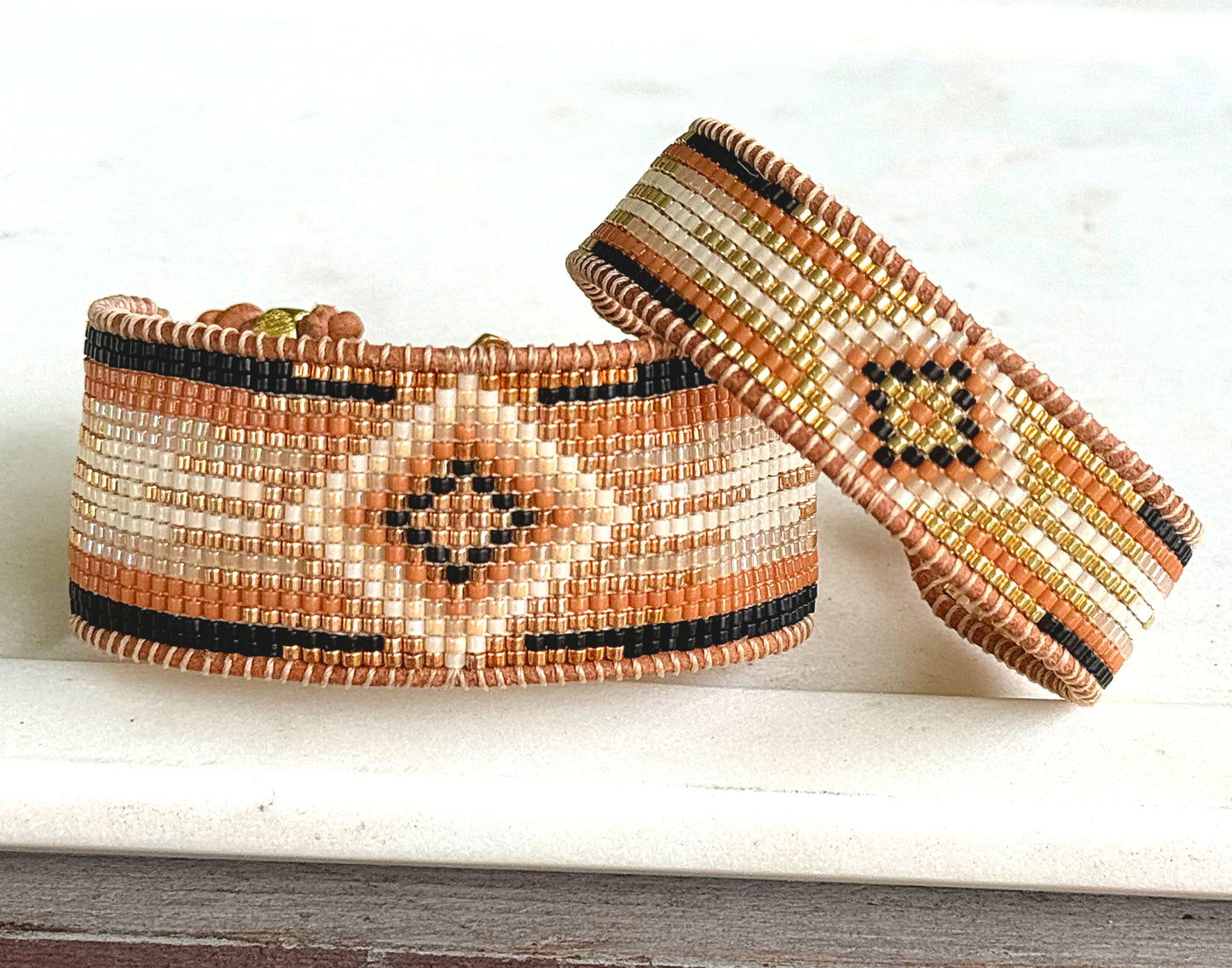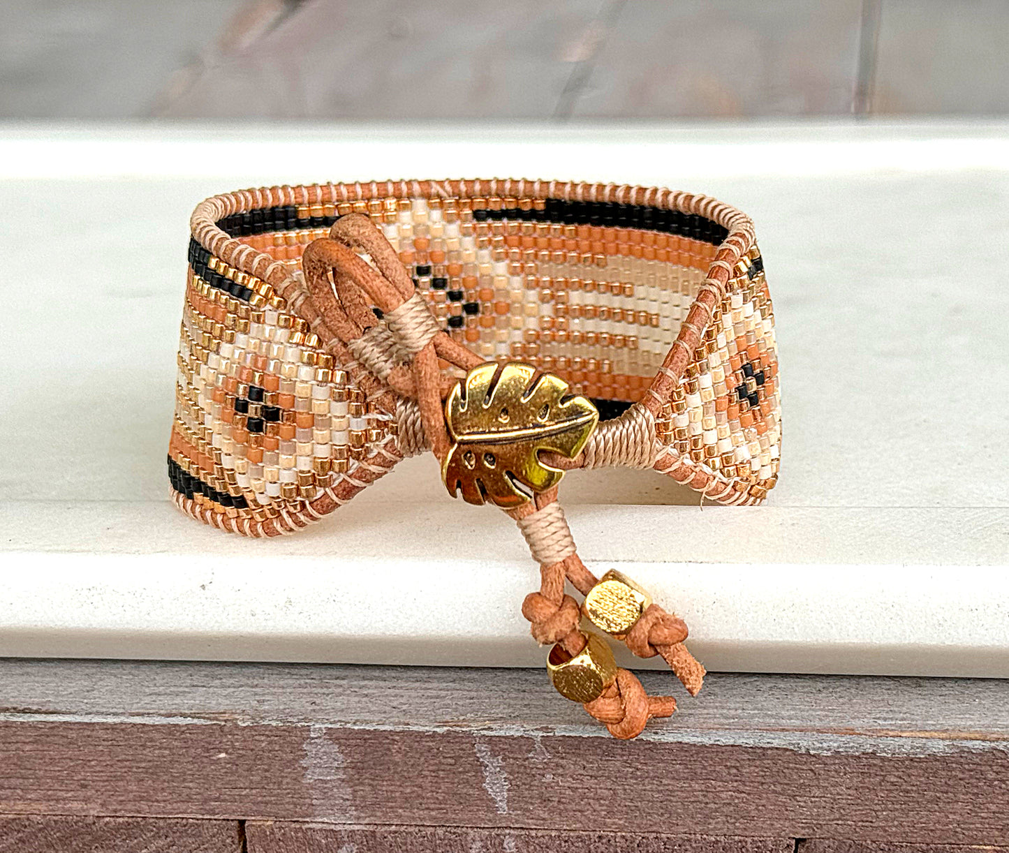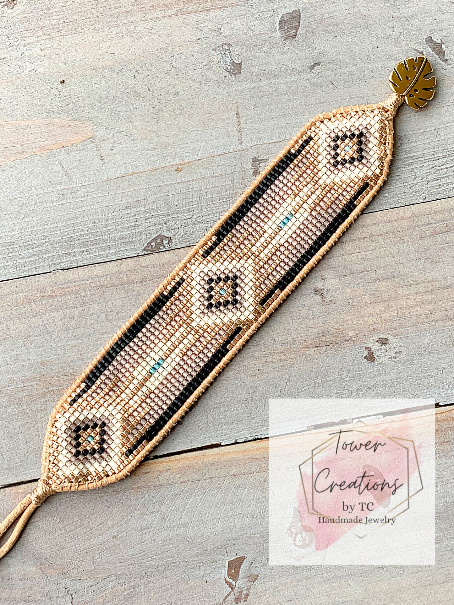 Gold, Honey Tan, and Black Bead Loom Woven Bracelet