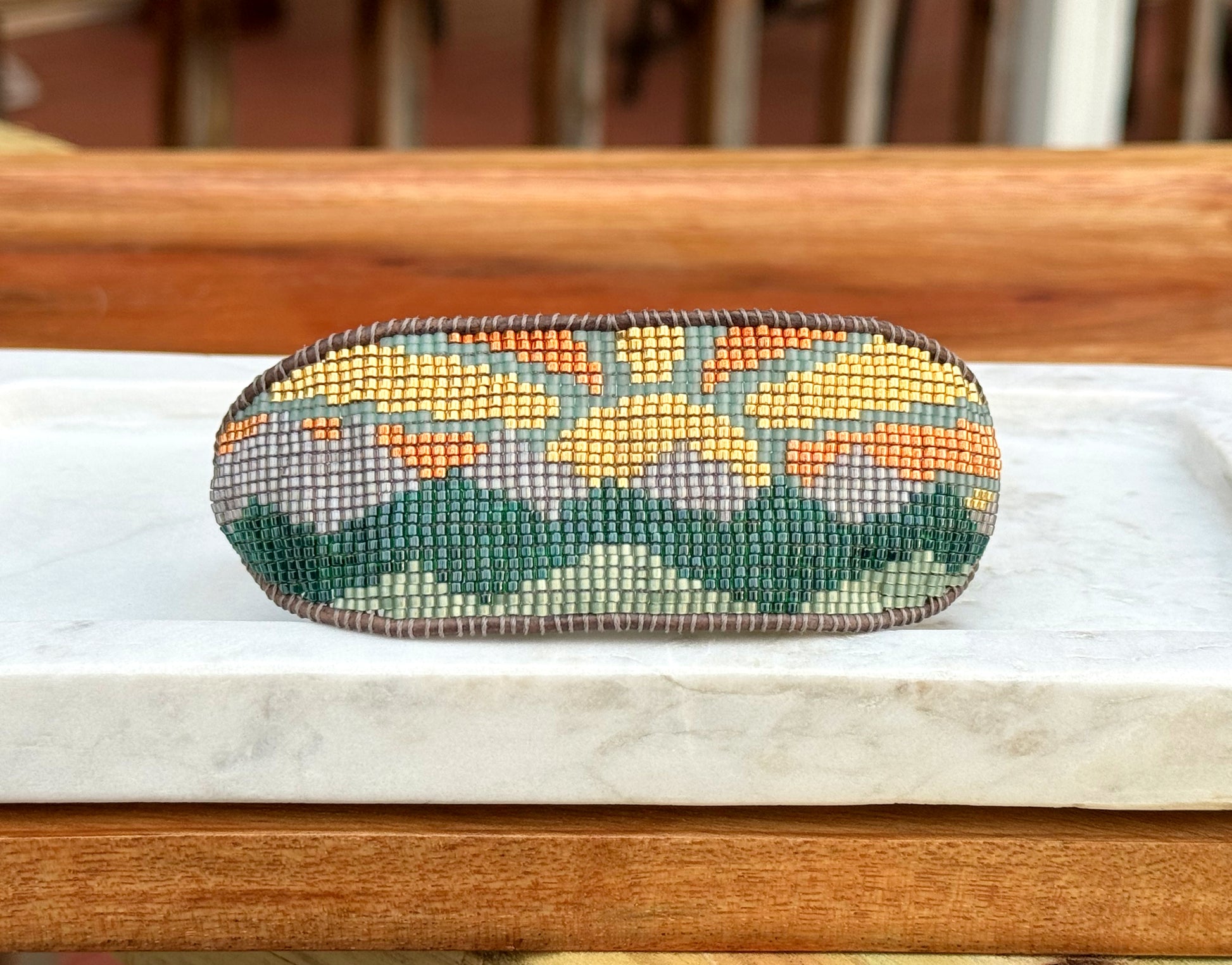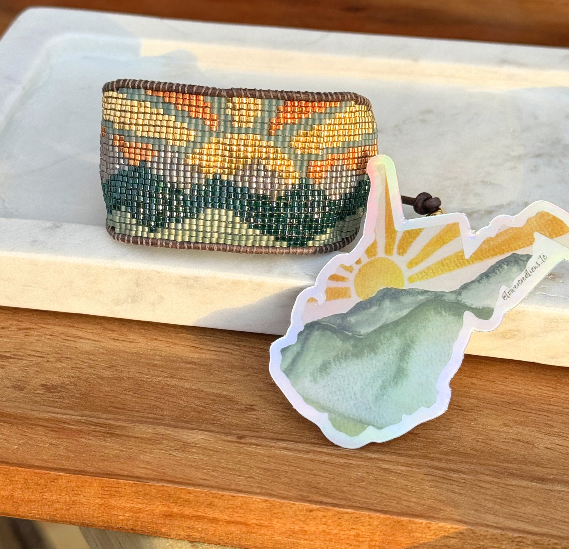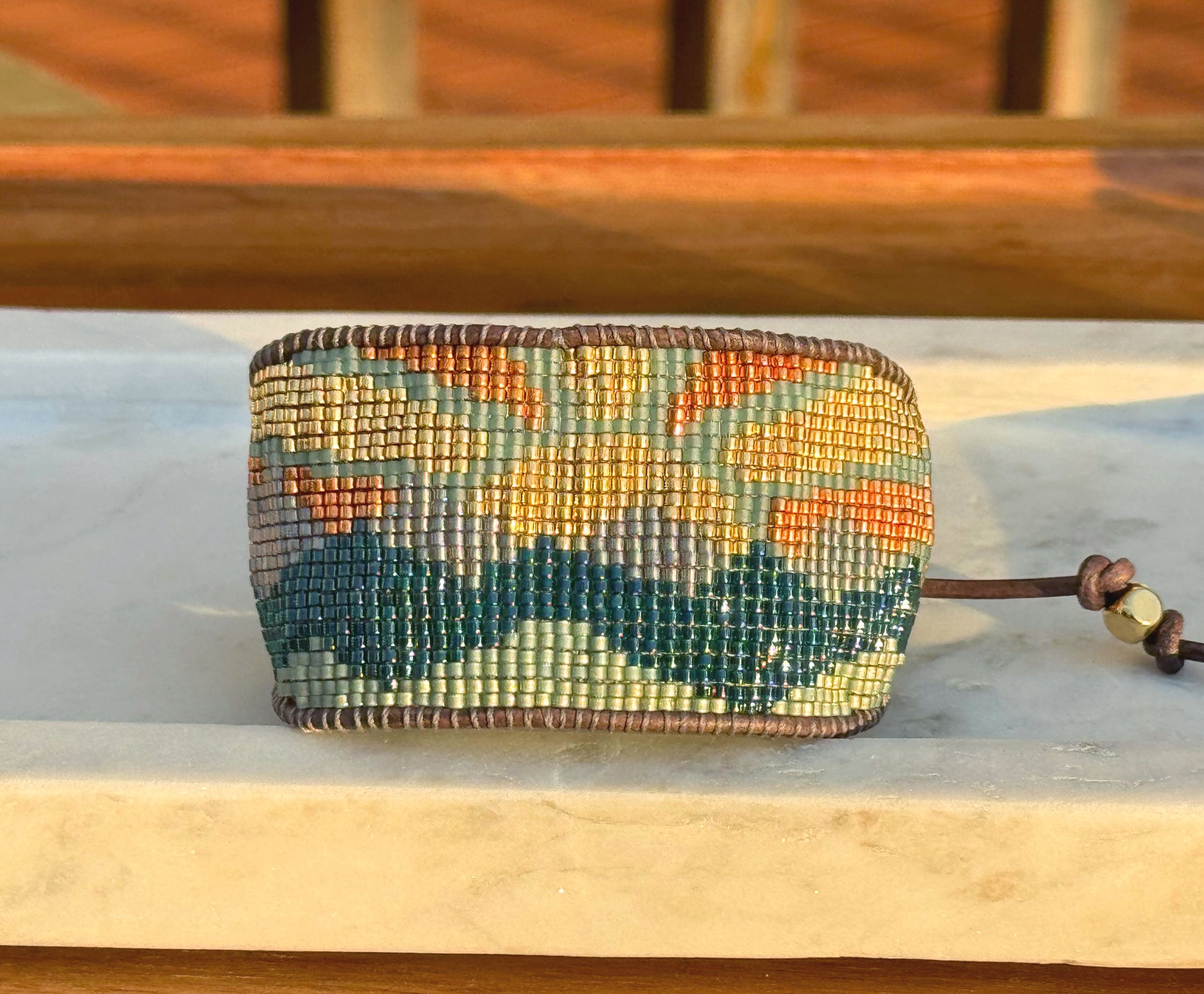 This gorgeous, hand beaded, loom woven bracelet is inspired by a gorgeous sun setting over the mountains. Whether a piece to remember your favorite place, or a reminder of home, this bracelet is beautifully crafted. The pattern is an original creation and never truly duplicated making each bracelet one of a kind.